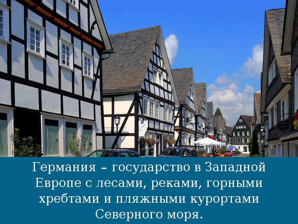 Германия – государство в Западной Европе с лесами, реками, горными хребтами и пляжными курортами Северного моря.