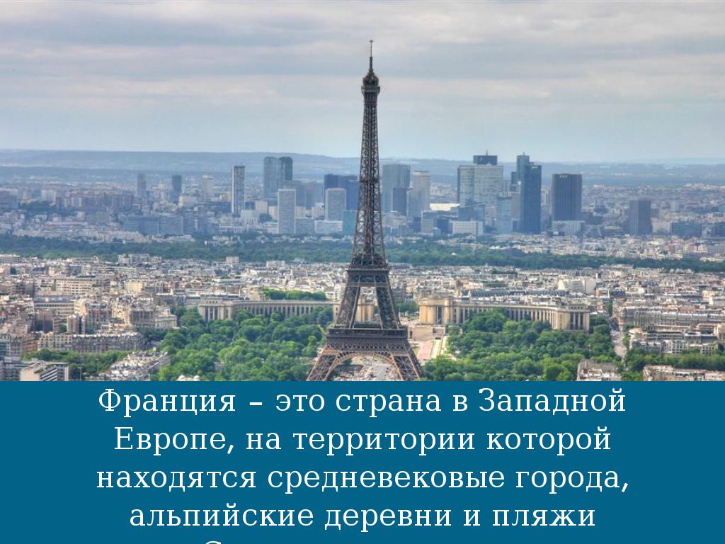 Франция – это страна в Западной Европе, на территории которой находятся средневековые города, альпийские деревни и пляжи Средиземного моря.