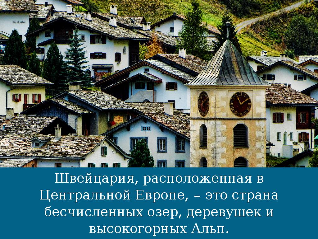 Швейцария, расположенная в Центральной Европе, – это страна бесчисленных озер, деревушек и высокогорных Альп.