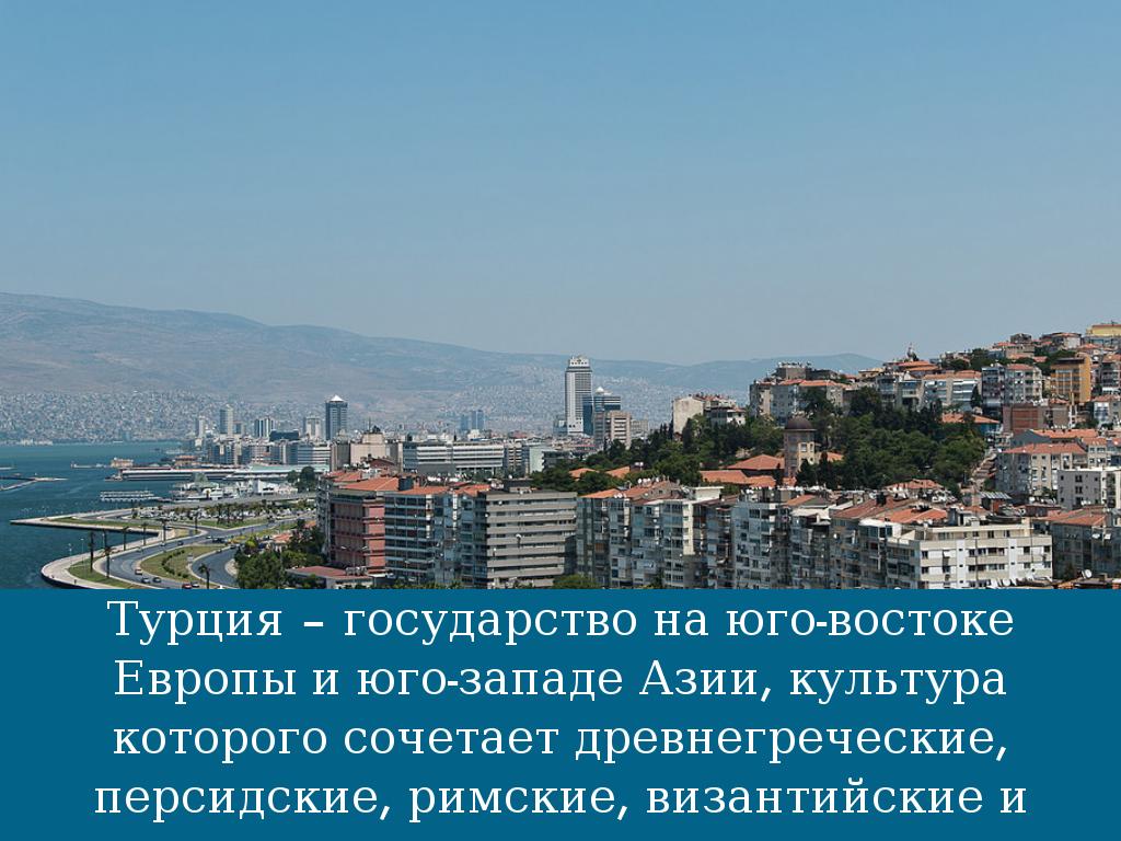 Турция – государство на юго-востоке Европы и юго-западе Азии, культура которого сочетает древнегреческие, персидские, римские, византийские и османские традиции.