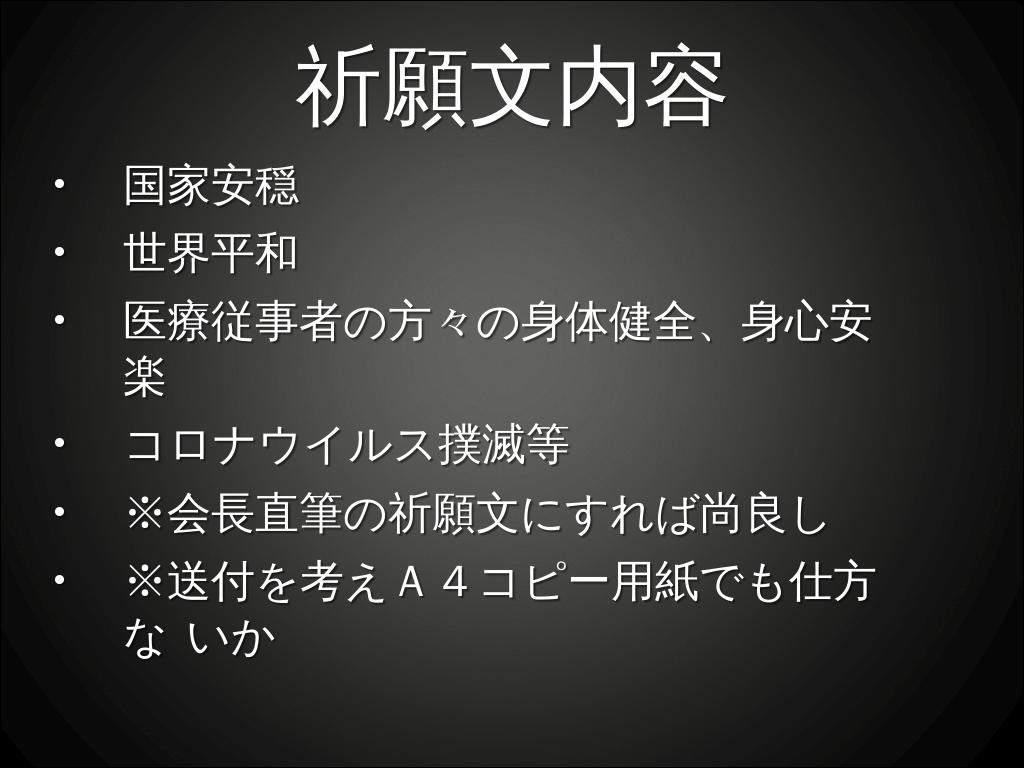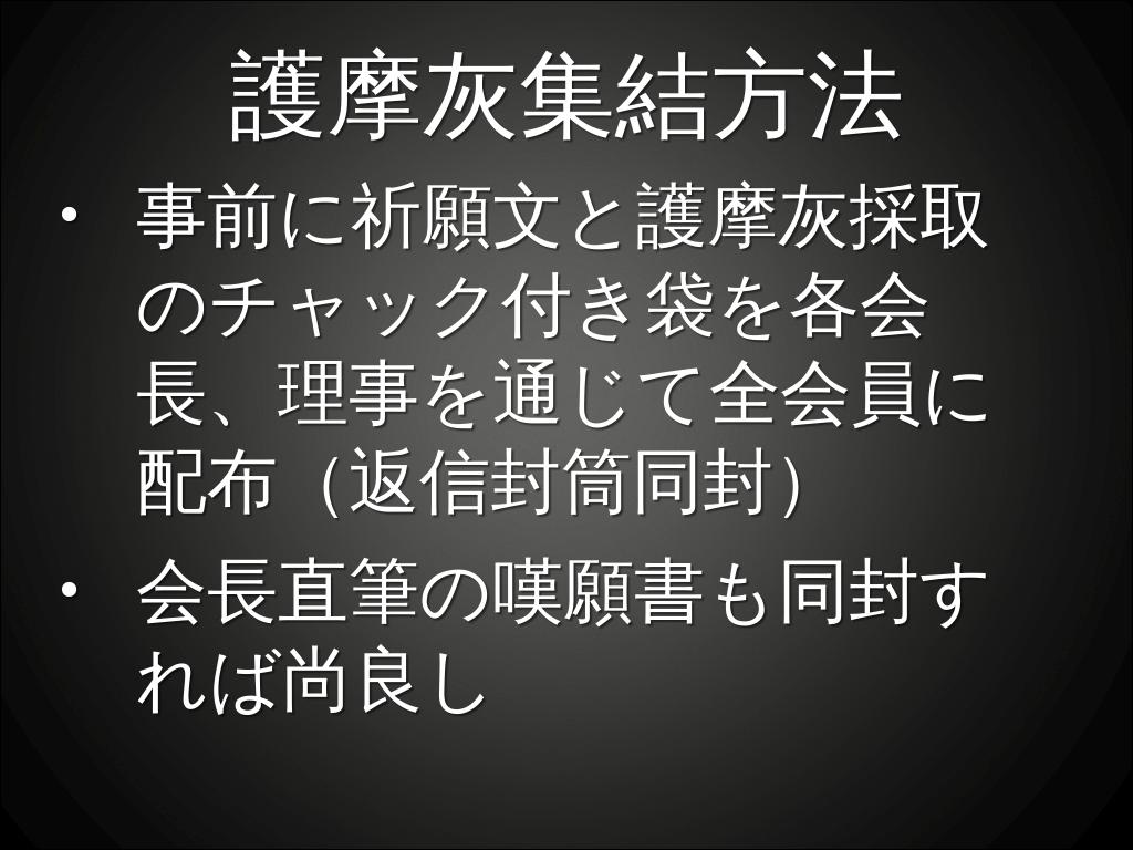 - 事前に祈願文と護摩灰採取のチャック付き袋を各会長、理事を通じて全会員に配布(返信封筒同封)