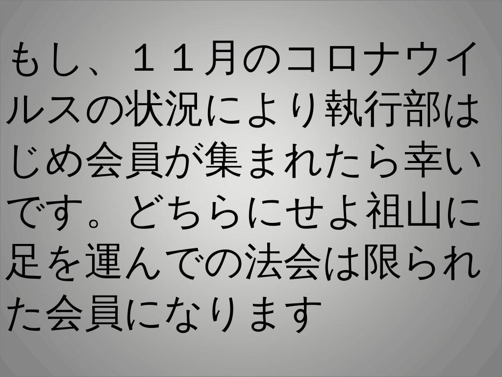 もし、11月のコロナウイルスの状況により執行部はじめ会員が集まれたら幸いです。どちらにせよ祖山に足を運んでの法会は限られた会員になります