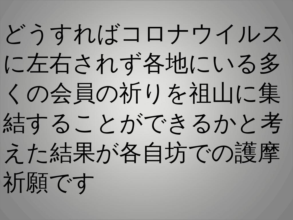 どうすればコロナウイルスに左右されず各地にいる多くの会員の祈りを祖山に集結することができるかと考えた結果が各自坊での護摩祈願です