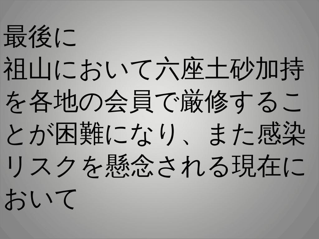 祖山において六座土砂加持を各地の会員で厳修することが困難になり、また感染リスクを懸念される現在において