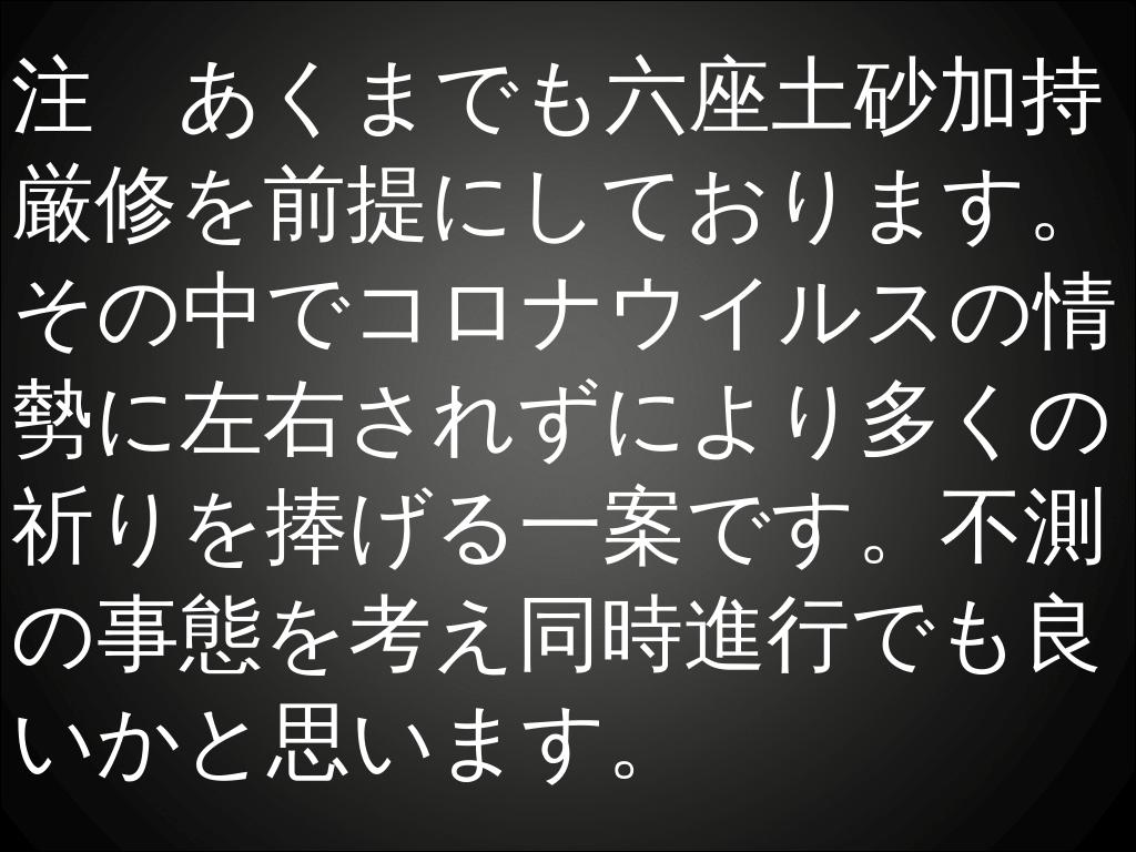 注 あくまでも六座土砂加持厳修を前提にしております。その中でコロナウイルスの情勢に左右されずにより多くの祈りを捧げる一案です。不測の事態を考え同時進行でも良いかと思います。
