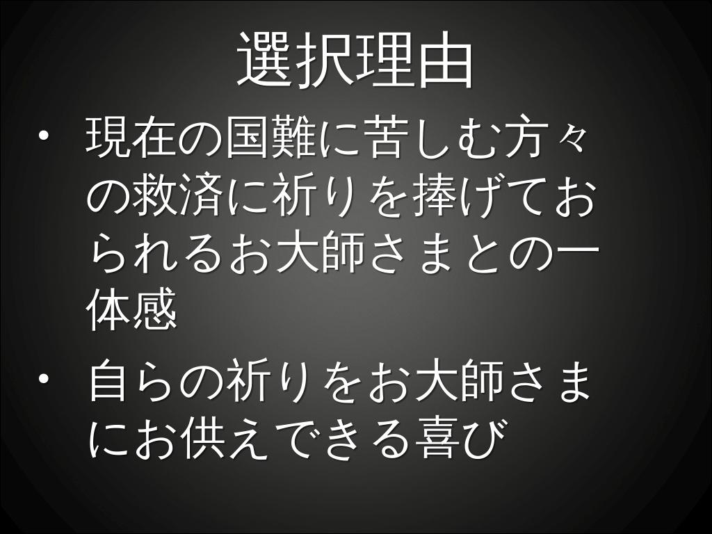 - 現在の国難に苦しむ方々の救済に祈りを捧げておられるお大師さまとの一体感