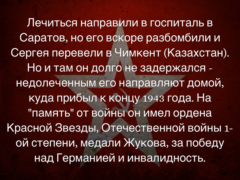 Лечиться направили в госпиталь в Саратов, но его вскоре разбомбили и Сергея перевели в Чимкент (Казахстан). Но и там он долго не задержался - недолеченным его направляют домой, куда прибыл к концу 1943 года. На "память" от войны он имел ордена Красной Звезды, Отечественной войны 1-ой степени, медали Жукова, за победу над Германией и инвалидность.