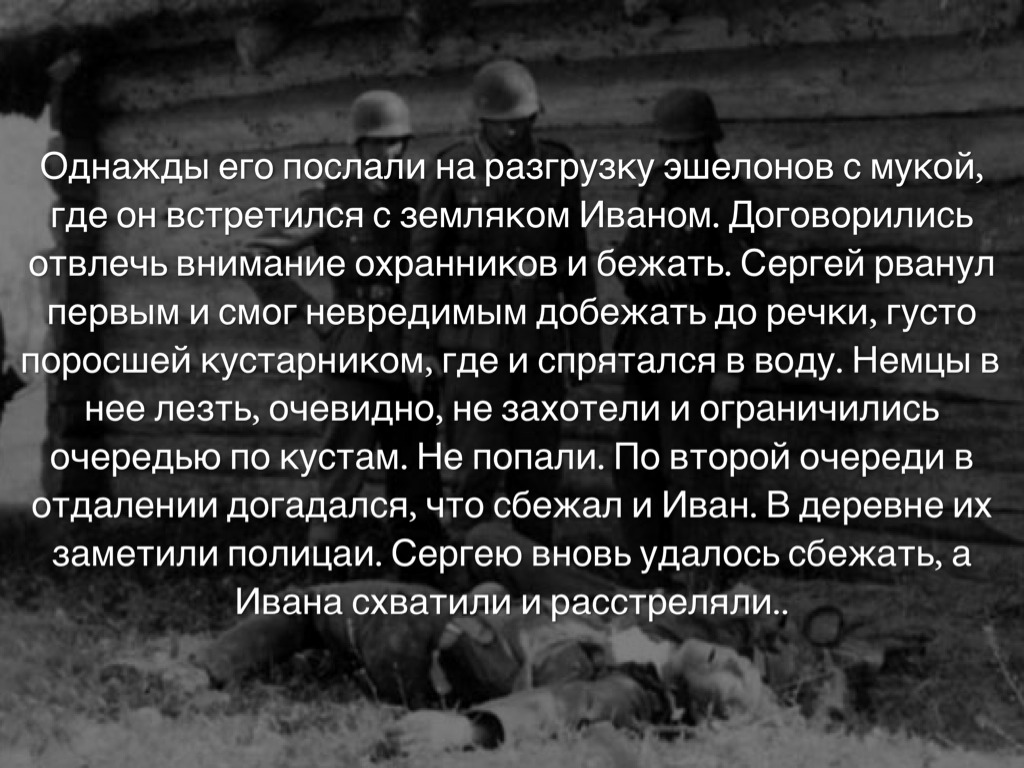 Однажды его послали на разгрузку эшелонов с мукой, где он встретился с земляком Иваном. Договорились отвлечь внимание охранников и бежать. Сергей рванул первым и смог невредимым добежать до речки, густо поросшей кустарником, где и спрятался в воду. Немцы в нее лезть, очевидно, не захотели и ограничились очередью по кустам. Не попали. По второй очереди в отдалении догадался, что сбежал и Иван. В деревне их заметили полицаи. Сергею вновь удалось сбежать, а Ивана схватили и расстреляли..