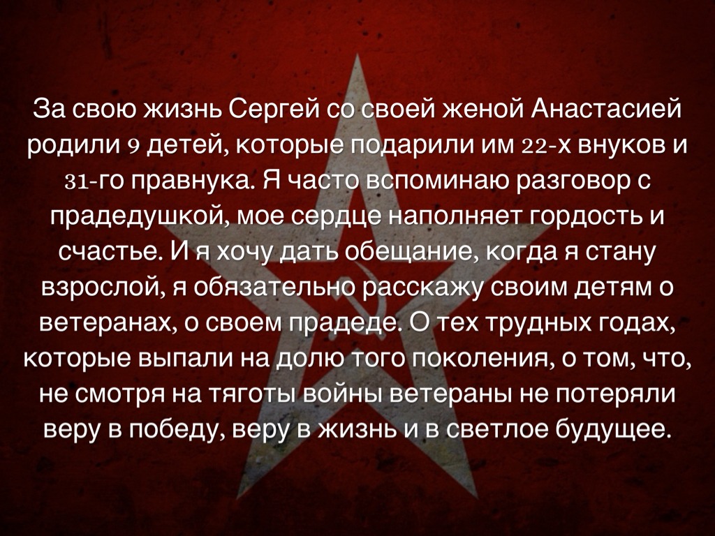 За свою жизнь Сергей со своей женой Анастасией родили 9 детей, которые подарили им 22-х внуков и 31-го правнука. Я часто вспоминаю разговор с прадедушкой, мое сердце наполняет гордость и счастье. И я хочу дать обещание, когда я стану взрослой, я обязательно расскажу своим детям о ветеранах, о своем прадеде. О тех трудных годах, которые выпали на долю того поколения, о том, что, не смотря на тяготы войны ветераны не потеряли веру в победу, веру в жизнь и в светлое будущее.