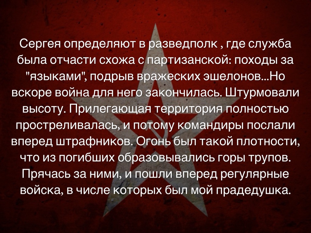 Сергея определяют в разведполк , где служба была отчасти схожа с партизанской: походы за "языками", подрыв вражеских эшелонов...Но вскоре война для него закончилась. Штурмовали высоту. Прилегающая территория полностью простреливалась, и потому командиры послали вперед штрафников. Огонь был такой плотности, что из погибших образовывались горы трупов. Прячась за ними, и пошли вперед регулярные войска, в числе которых был мой прадедушка.