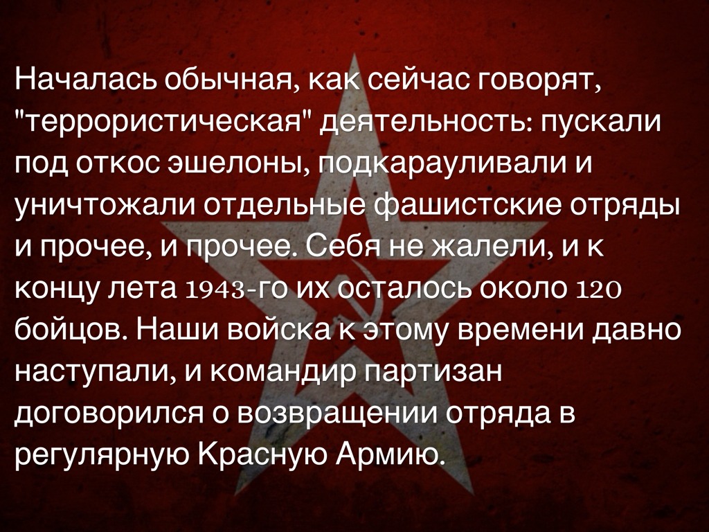 Началась обычная, как сейчас говорят, "террористическая" деятельность: пускали под откос эшелоны, подкарауливали и уничтожали отдельные фашистские отряды и прочее, и прочее. Себя не жалели, и к концу лета 1943-го их осталось около 120 бойцов. Наши войска к этому времени давно наступали, и командир партизан договорился о возвращении отряда в регулярную Красную Армию.