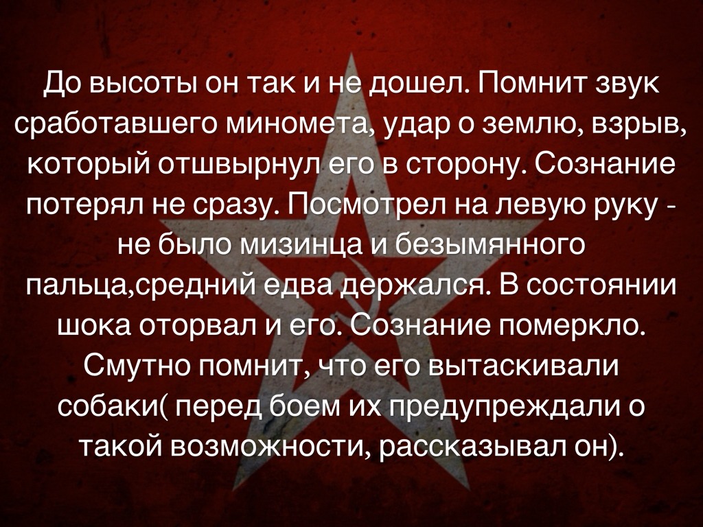 До высоты он так и не дошел. Помнит звук сработавшего миномета, удар о землю, взрыв, который отшвырнул его в сторону. Сознание потерял не сразу. Посмотрел на левую руку - не было мизинца и безымянного пальца,средний едва держался. В состоянии шока оторвал и его. Сознание померкло. Смутно помнит, что его вытаскивали собаки( перед боем их предупреждали о такой возможности, рассказывал он).