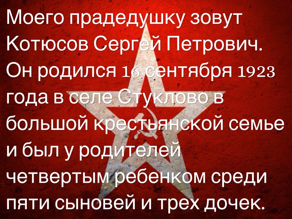 Моего прадедушку зовут Котюсов Сергей Петрович. Он родился 16 сентября 1923 года в селе Стуклово в большой крестьянской семье и был у родителей четвертым ребенком среди пяти сыновей и трех дочек.