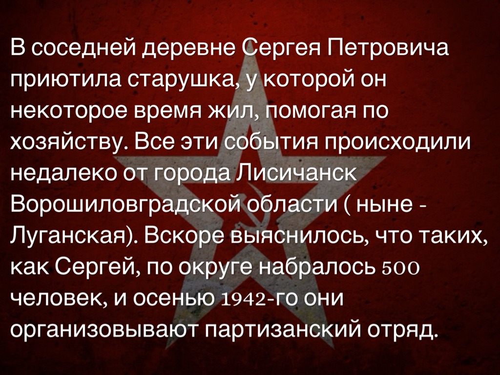 В соседней деревне Сергея Петровича приютила старушка, у которой он некоторое время жил, помогая по хозяйству. Все эти события происходили недалеко от города Лисичанск Ворошиловградской области ( ныне - Луганская). Вскоре выяснилось, что таких, как Сергей, по округе набралось 500 человек, и осенью 1942-го они организовывают партизанский отряд.