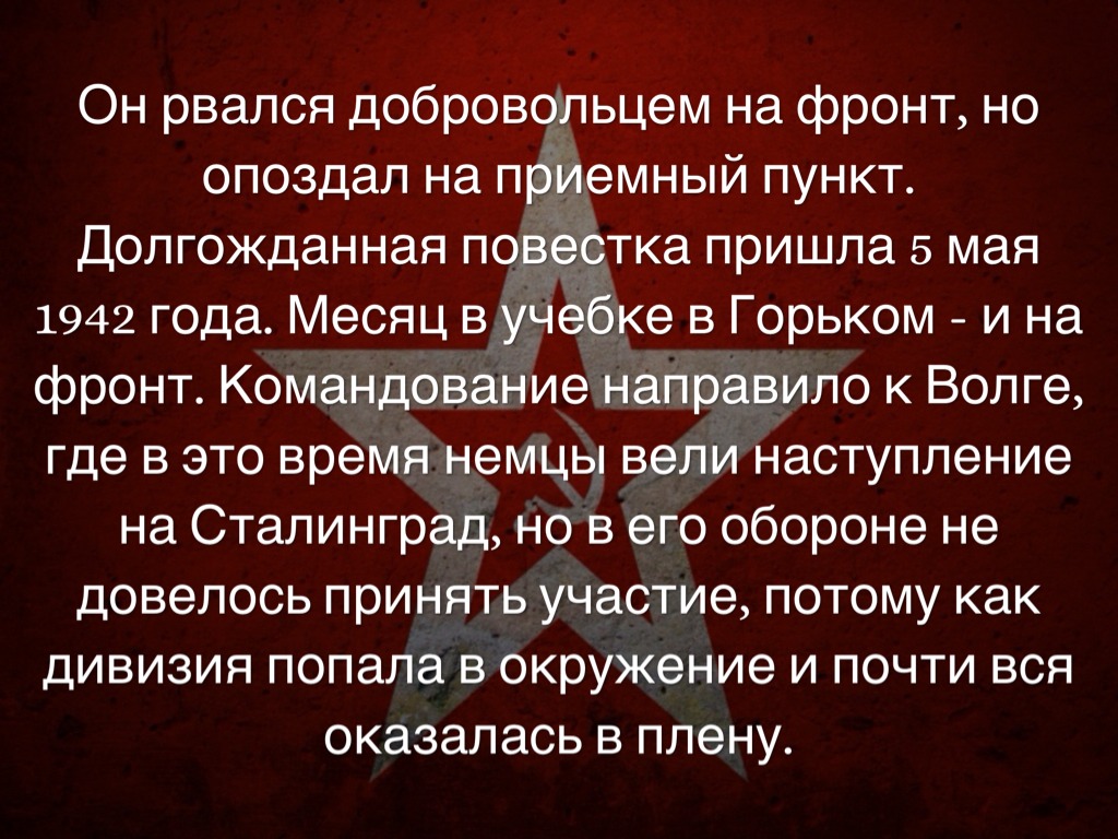 Он рвался добровольцем на фронт, но опоздал на приемный пункт. Долгожданная повестка пришла 5 мая 1942 года. Месяц в учебке в Горьком - и на фронт. Командование направило к Волге, где в это время немцы вели наступление на Сталинград, но в его обороне не довелось принять участие, потому как дивизия попала в окружение и почти вся оказалась в плену.