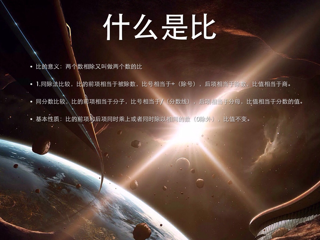 基本性质:比的前项和后项同时乘上或者同时除以相同的数(0除外),比值不变。