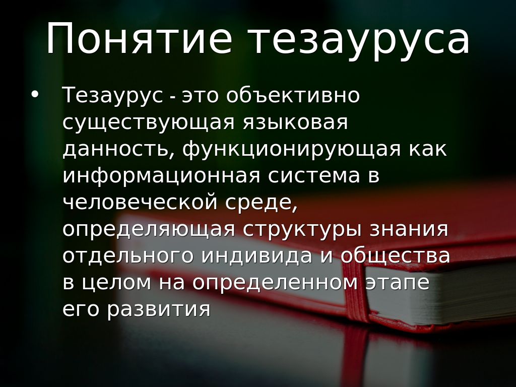 Тезаурус - это объективно существующая языковая данность, функционирующая как информационная система в человеческой среде, определяющая структуры знания отдельного индивида и общества в целом на определенном этапе его развития