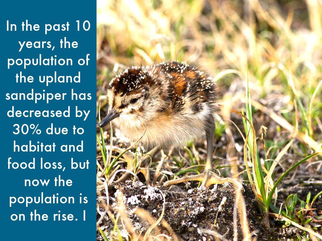 In the past 10 years, the population of the upland sandpiper has decreased by 30% due to habitat and food loss, but now the population is on the rise. I