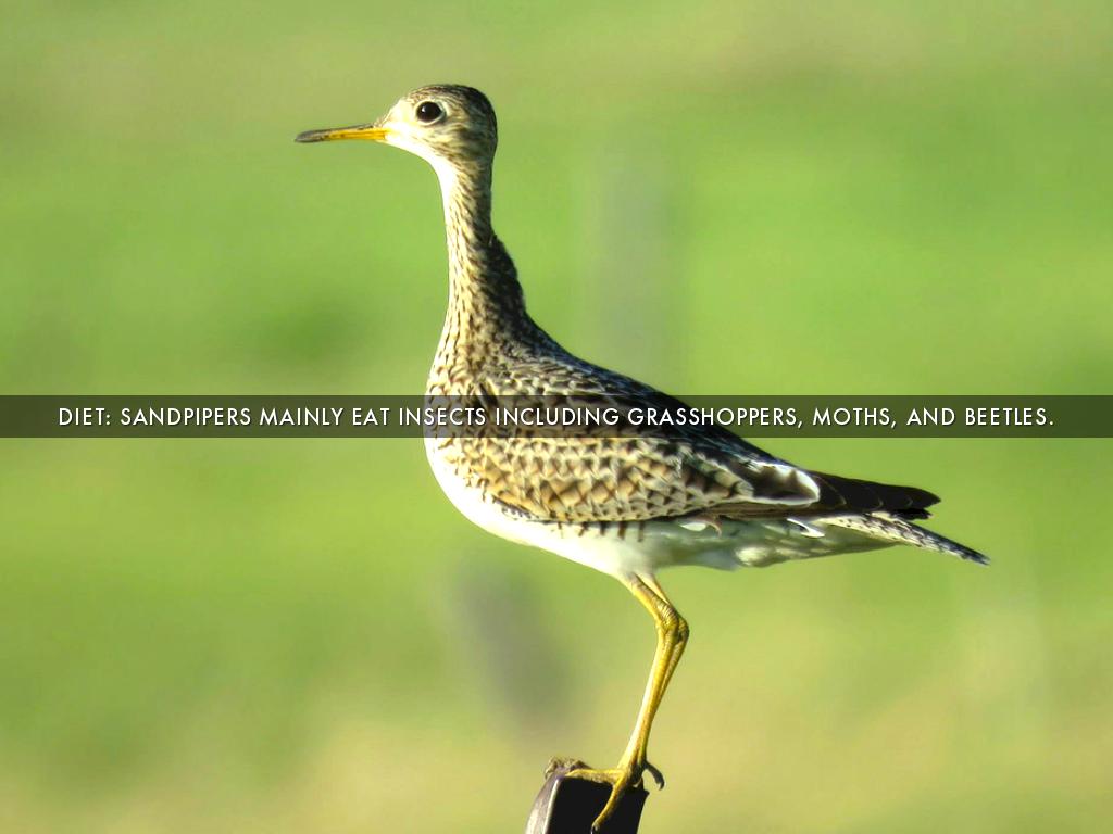 DIET: SANDPIPERS MAINLY EAT INSECTS INCLUDING GRASSHOPPERS, MOTHS, AND BEETLES.
