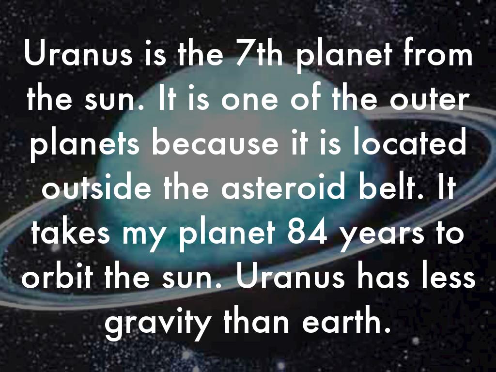 Uranus is the 7th planet from the sun. It is one of the outer planets because it is located outside the asteroid belt. It takes my planet 84 years to orbit the sun. Uranus has less gravity than earth.