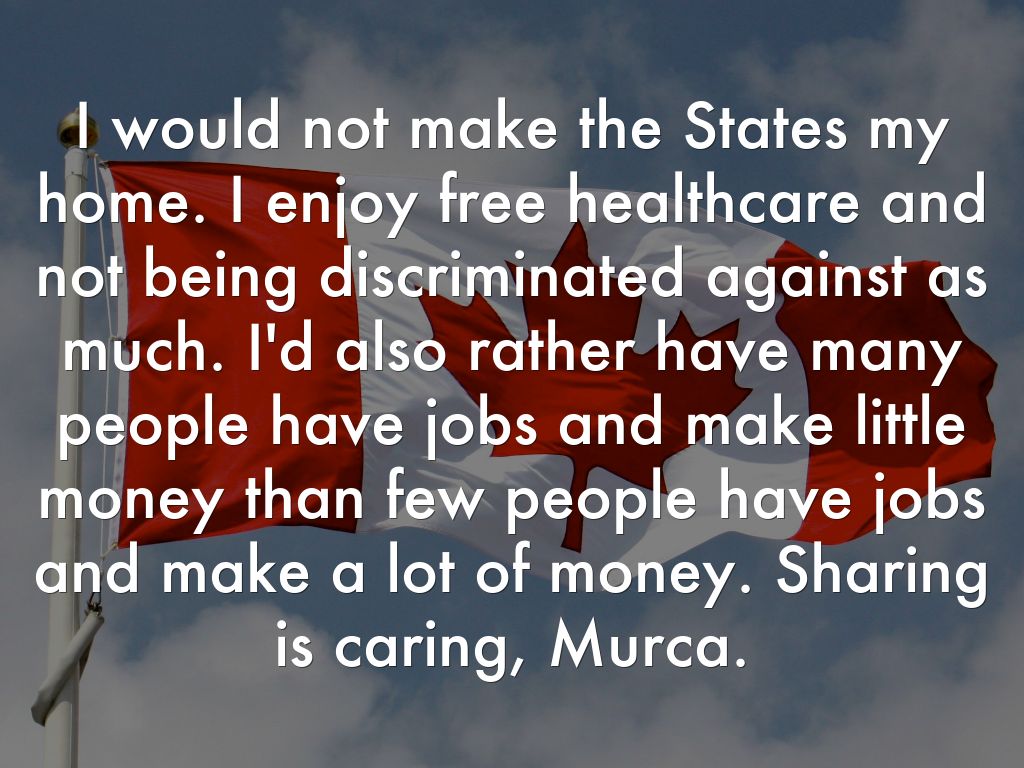 I would not make the States my home. I enjoy free healthcare and not being discriminated against as much. I'd also rather have many people have jobs and make little money than few people have jobs and make a lot of money. Sharing is caring, Murca.