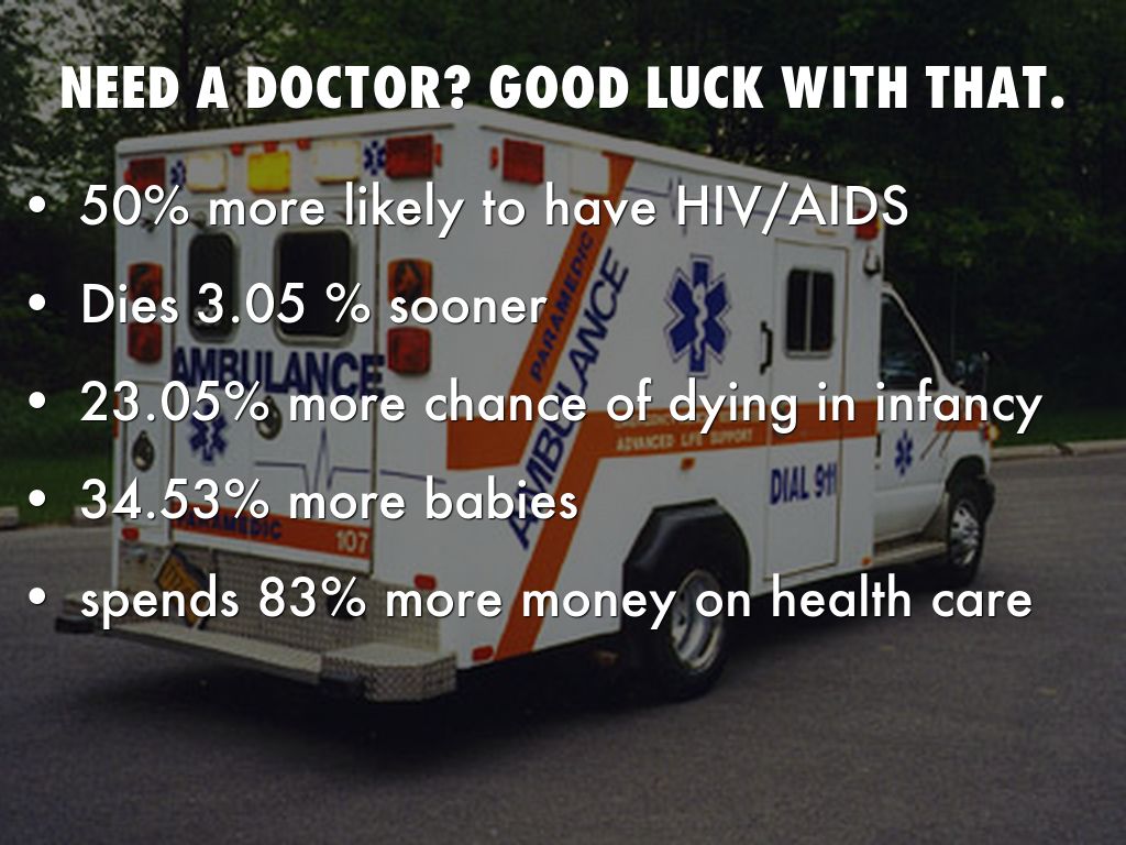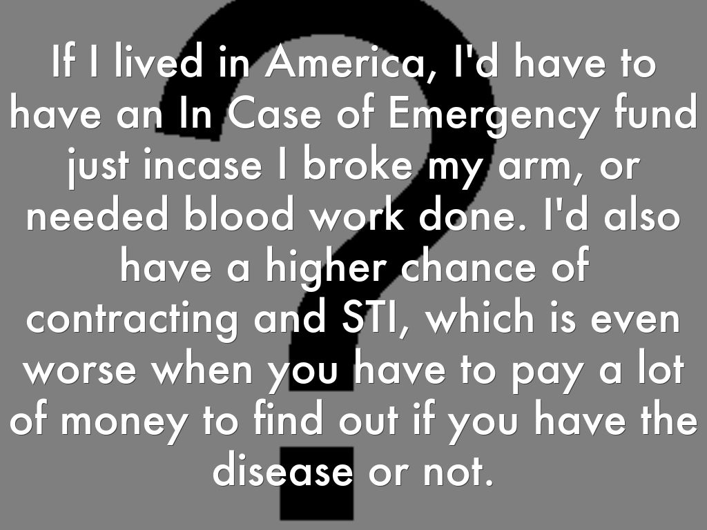 If I lived in America, I'd have to have an In Case of Emergency fund just incase I broke my arm, or needed blood work done. I'd also have a higher chance of contracting and STI, which is even worse when you have to pay a lot of money to find out if you have the disease or not.