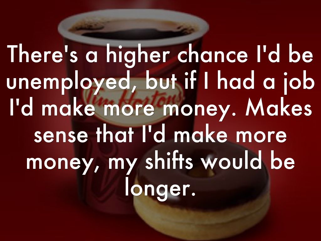 There's a higher chance I'd be unemployed, but if I had a job I'd make more money. Makes sense that I'd make more money, my shifts would be longer.