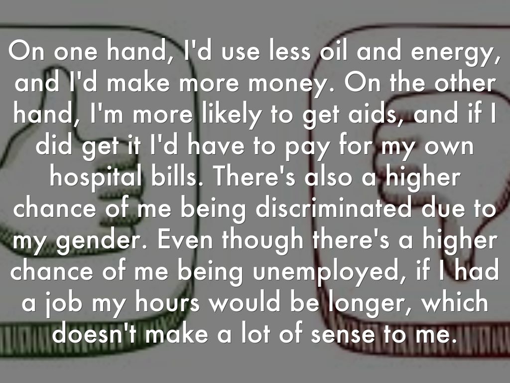 On one hand, I'd use less oil and energy, and I'd make more money. On the other hand, I'm more likely to get aids, and if I did get it I'd have to pay for my own hospital bills. There's also a higher chance of me being discriminated due to my gender. Even though there's a higher chance of me being unemployed, if I had a job my hours would be longer, which doesn't make a lot of sense to me.