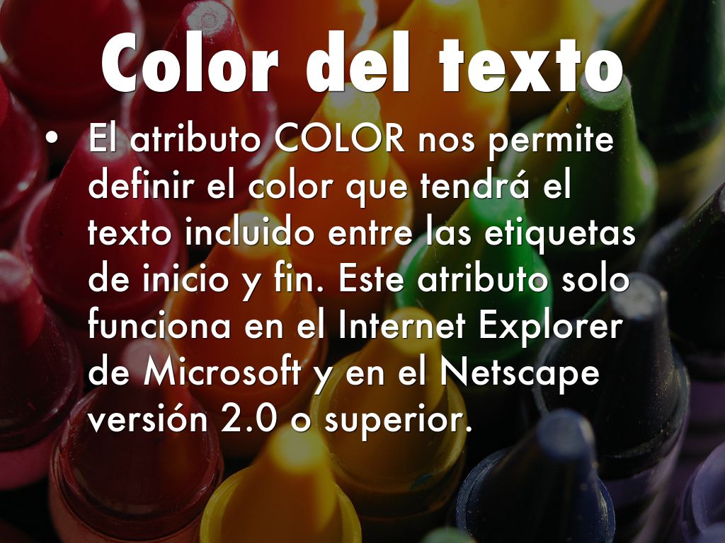 El atributo COLOR nos permite definir el color que tendrá el texto incluido entre las etiquetas de inicio y fin. Este atributo solo funciona en el Internet Explorer de Microsoft y en el Netscape versión 2.0 o superior.