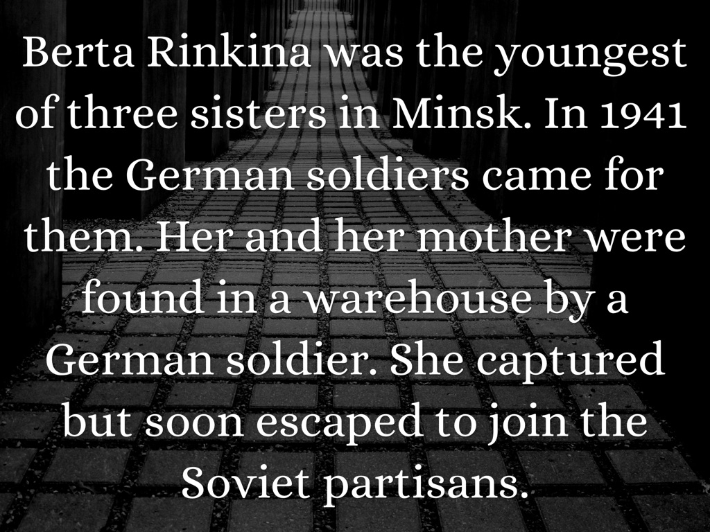 Berta Rinkina was the youngest of three sisters in Minsk. In 1941 the German soldiers came for them. Her and her mother were found in a warehouse by a German soldier. She captured but soon escaped to join the Soviet partisans.