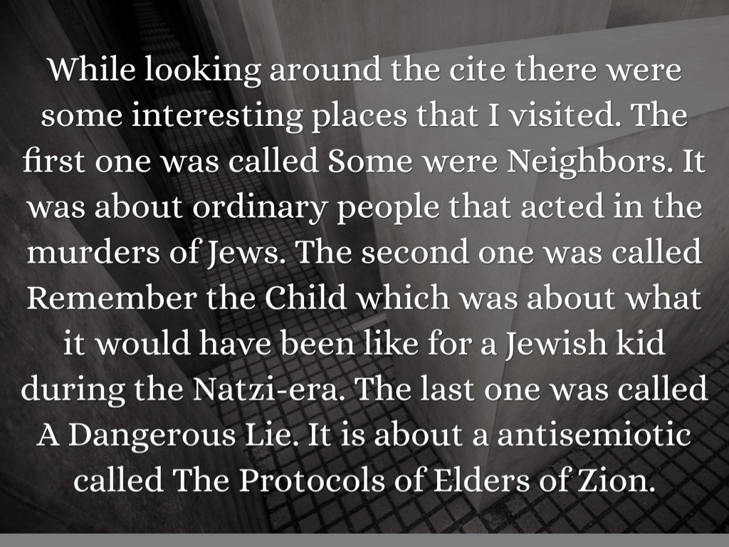 While looking around the cite there were some interesting places that I visited. The first one was called Some were Neighbors. It was about ordinary people that acted in the murders of Jews. The second one was called Remember the Child which was about what it would have been like for a Jewish kid during the Natzi-era. The last one was called A Dangerous Lie. It is about a antisemiotic called The Protocols of Elders of Zion.