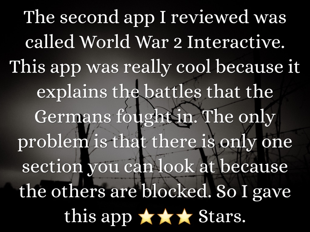 The second app I reviewed was called World War 2 Interactive. This app was really cool because it explains the battles that the Germans fought in. The only problem is that there is only one section you can look at because the others are blocked. So I gave this app ⭐️⭐️⭐️ Stars.