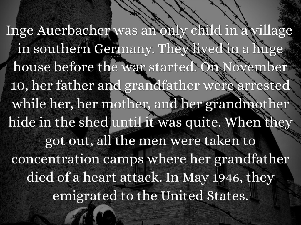 Inge Auerbacher was an only child in a village in southern Germany. They lived in a huge house before the war started. On November 10, her father and grandfather were arrested while her, her mother, and her grandmother hide in the shed until it was quite. When they got out, all the men were taken to concentration camps where her grandfather died of a heart attack. In May 1946, they emigrated to the United States.