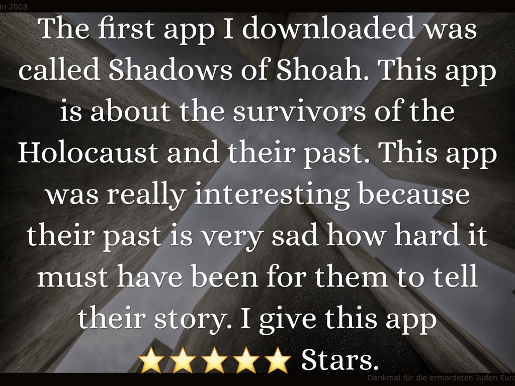 The first app I downloaded was called Shadows of Shoah. This app is about the survivors of the Holocaust and their past. This app was really interesting because their past is very sad how hard it must have been for them to tell their story. I give this app ⭐️⭐️⭐️⭐️⭐️ Stars.