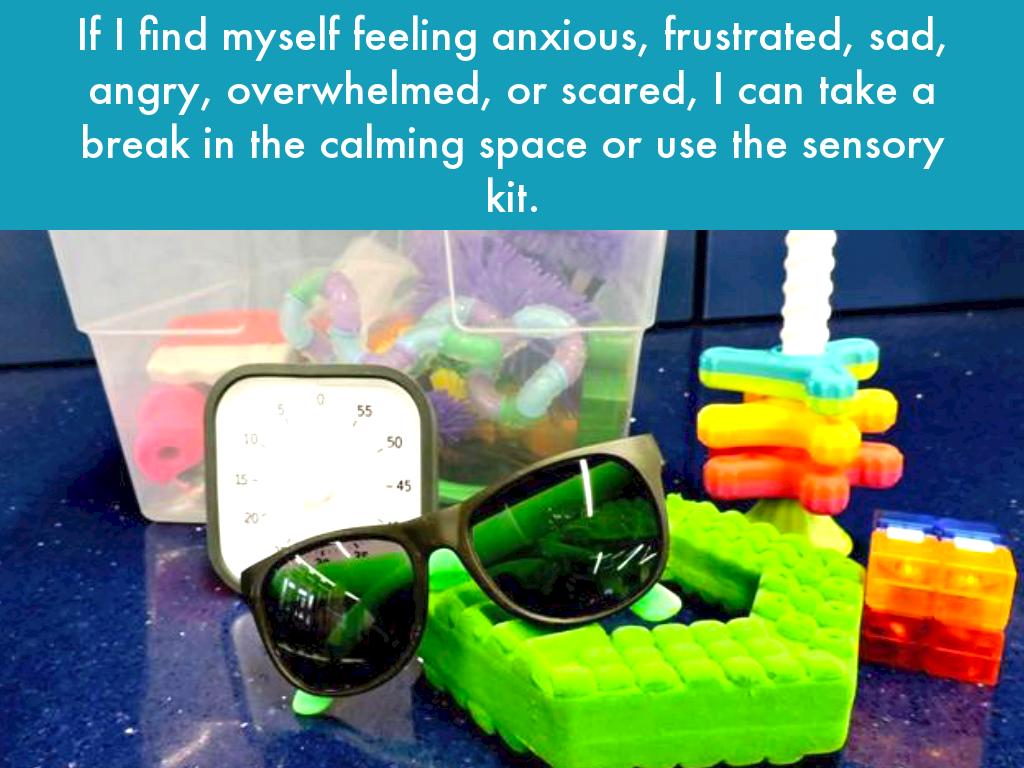 If I find myself feeling anxious, frustrated, sad, angry, overwhelmed, or scared, I can take a break in the calming space or use the sensory kit.