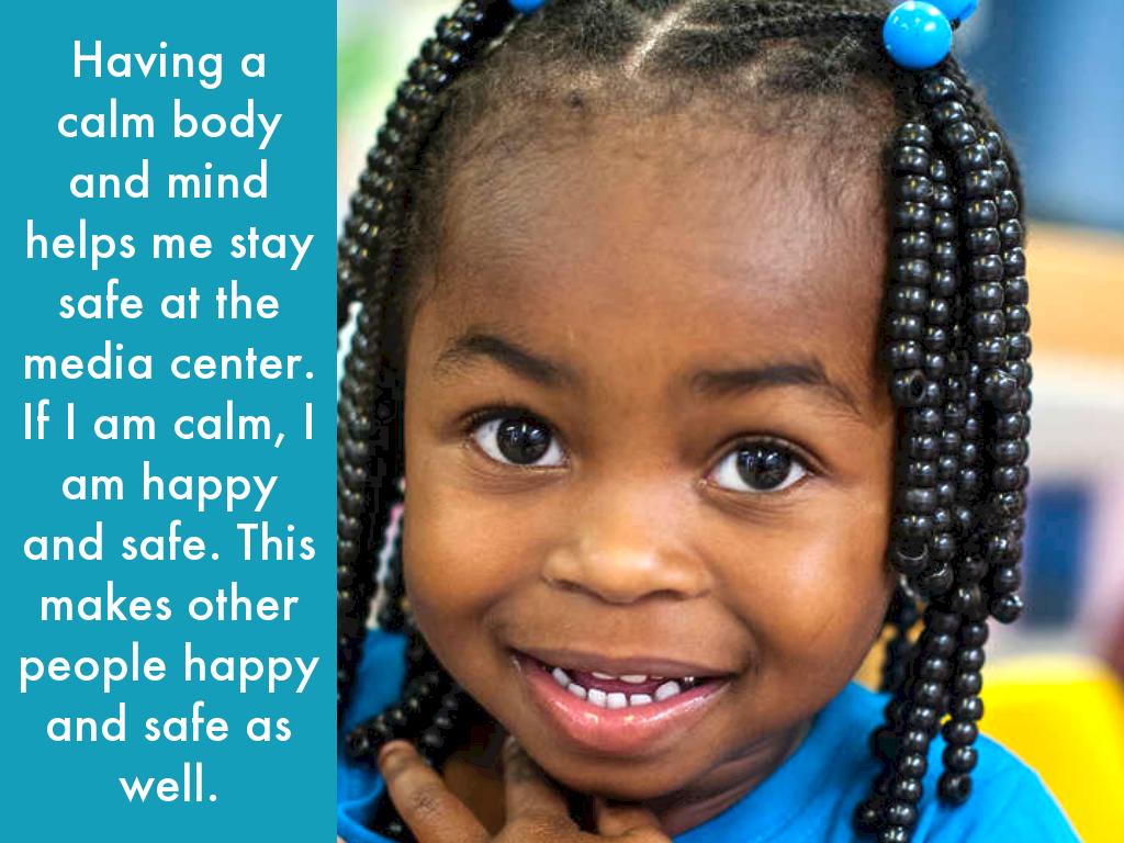 Having a calm body and mind helps me stay safe at the media center. If I am calm, I am happy and safe. This makes other people happy and safe as well.