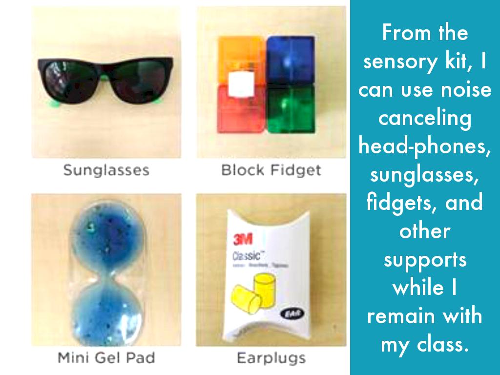 From the sensory kit, I can use noise canceling head-phones, sunglasses, fidgets, and other supports while I remain with my class.