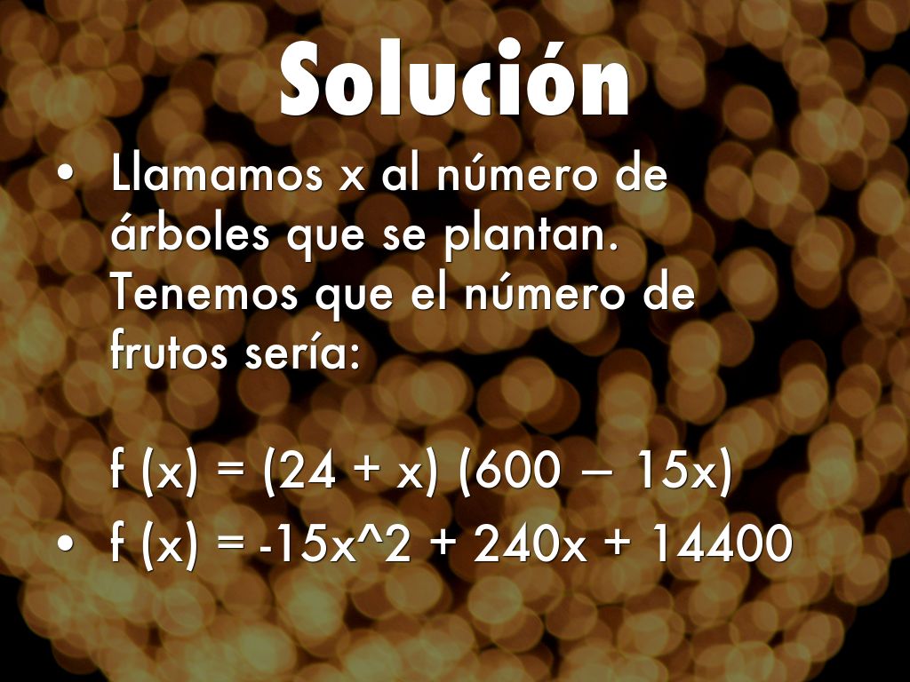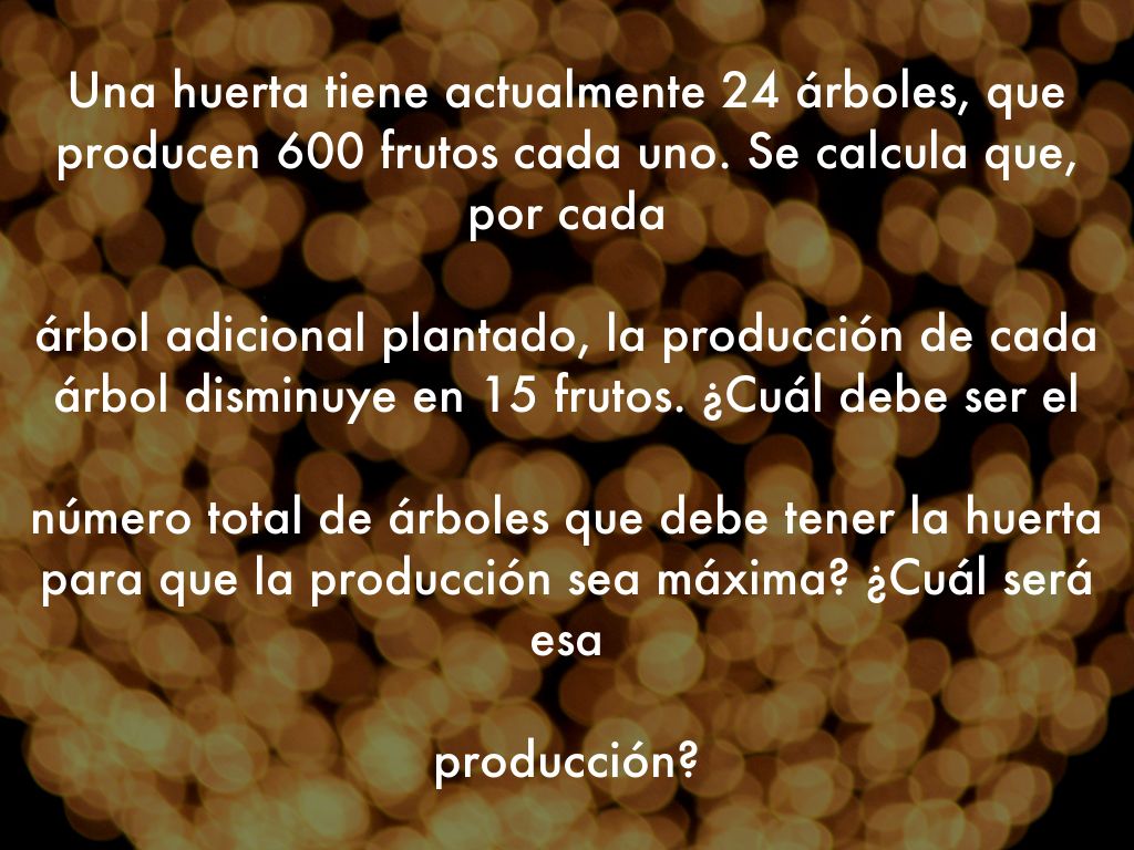 Llamamos x al número de árboles que se plantan. Tenemos que el número de frutos sería: f (x) = (24 + x) (600 − 15x)