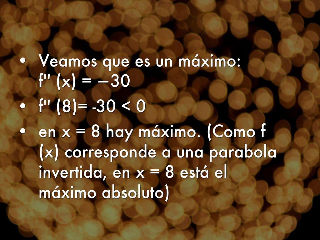 Veamos que es un máximo: f'' (x) = −30