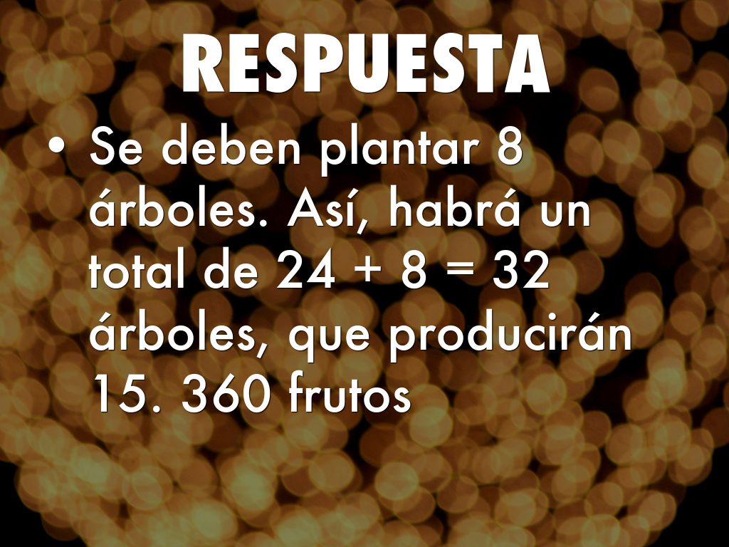 Se deben plantar 8 árboles. Así, habrá un total de 24 + 8 = 32 árboles, que producirán 15. 360 frutos