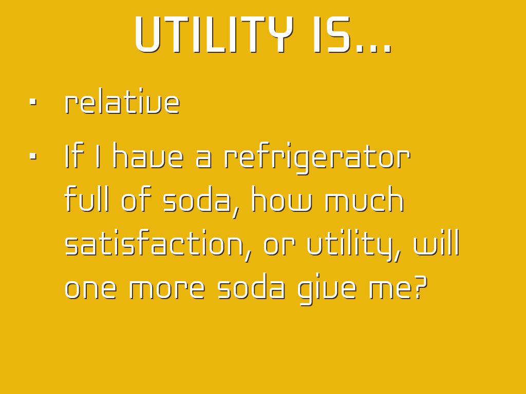 - If I have a refrigerator full of soda, how much satisfaction, or utility, will one more soda give me?