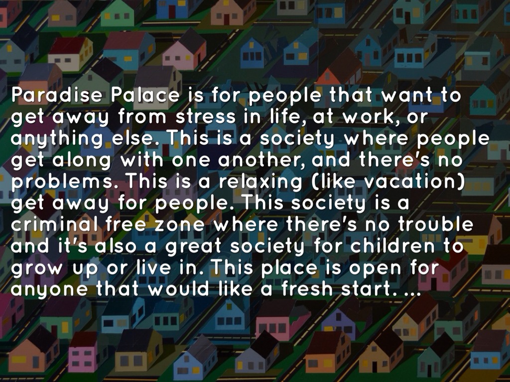 Paradise Palace is for people that want to get away from stress in life, at work, or anything else. This is a society where people get along with one another, and there's no problems. This is a relaxing (like vacation) get away for people. This society is a criminal free zone where there's no trouble and it's also a great society for children to grow up or live in. This place is open for anyone that would like a fresh start.