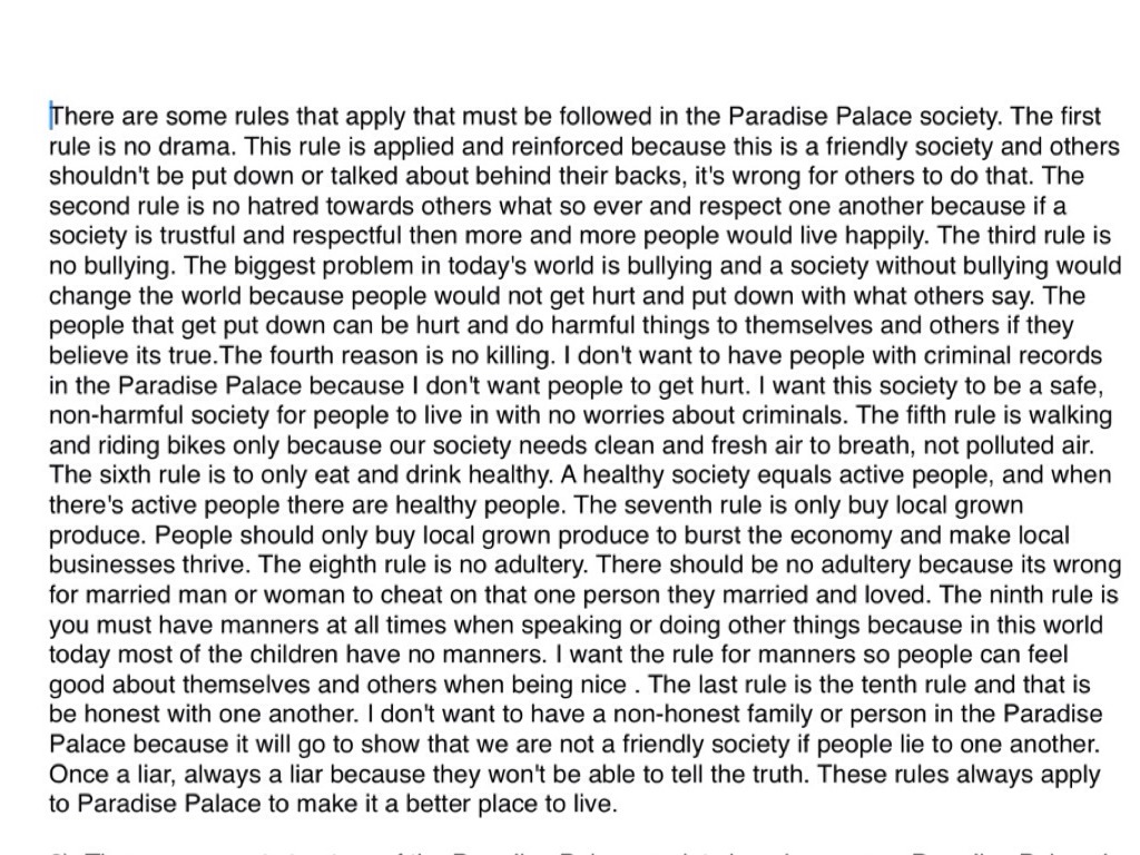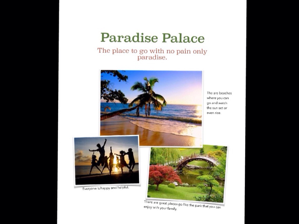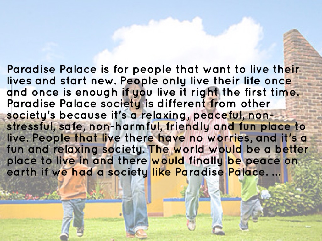 Paradise Palace is for people that want to live their lives and start new. People only live their life once and once is enough if you live it right the first time. Paradise Palace society is different from other society's because it's a relaxing, peaceful, non-stressful, safe, non-harmful, friendly and fun place to live. People that live there have no worries, and it's a fun and relaxing society. The world would be a better place to live in and there would finally be peace on earth if we had a society like Paradise Palace.