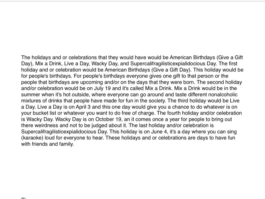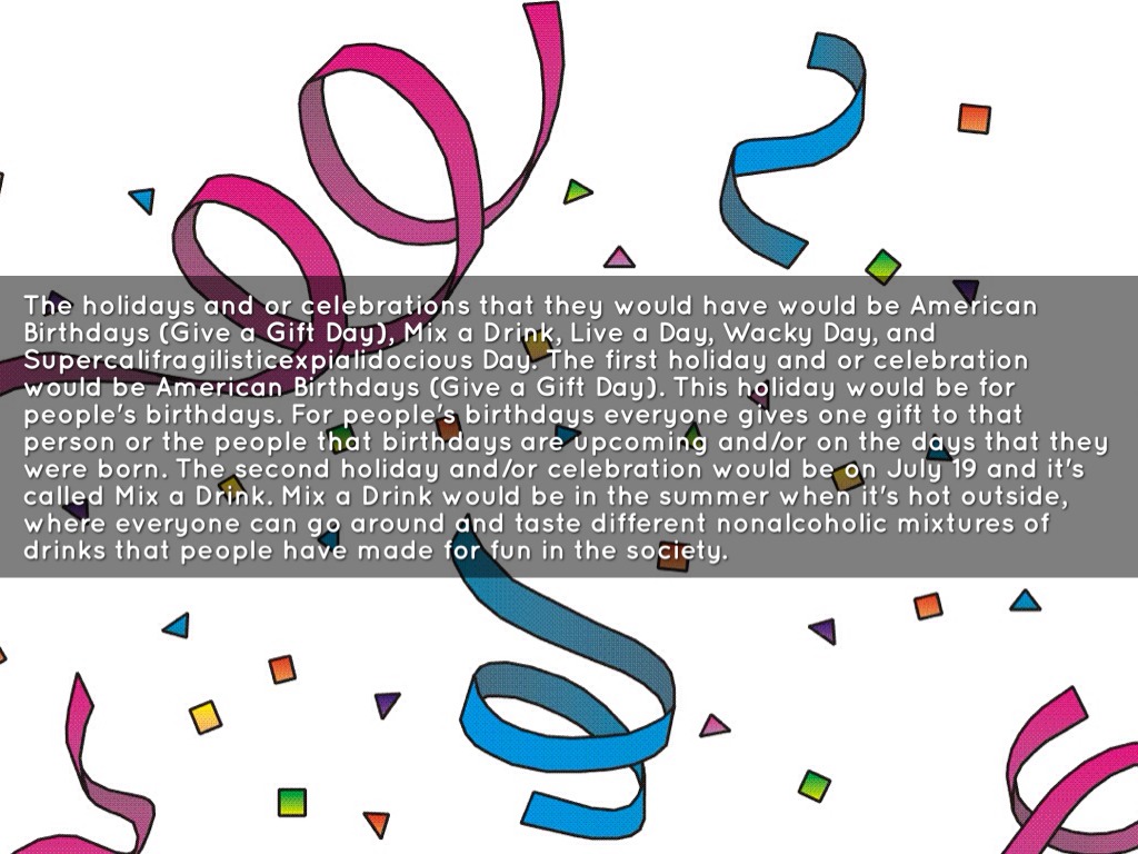 The holidays and or celebrations that they would have would be American Birthdays (Give a Gift Day), Mix a Drink, Live a Day, Wacky Day, and Supercalifragilisticexpialidocious Day. The first holiday and or celebration would be American Birthdays (Give a Gift Day). This holiday would be for people's birthdays. For people's birthdays everyone gives one gift to that person or the people that birthdays are upcoming and/or on the days that they were born. The second holiday and/or celebration would be on July 19 and it's called Mix a Drink. Mix a Drink would be in the summer when it's hot outside, where everyone can go around and taste different nonalcoholic mixtures of drinks that people have made for fun in the society.