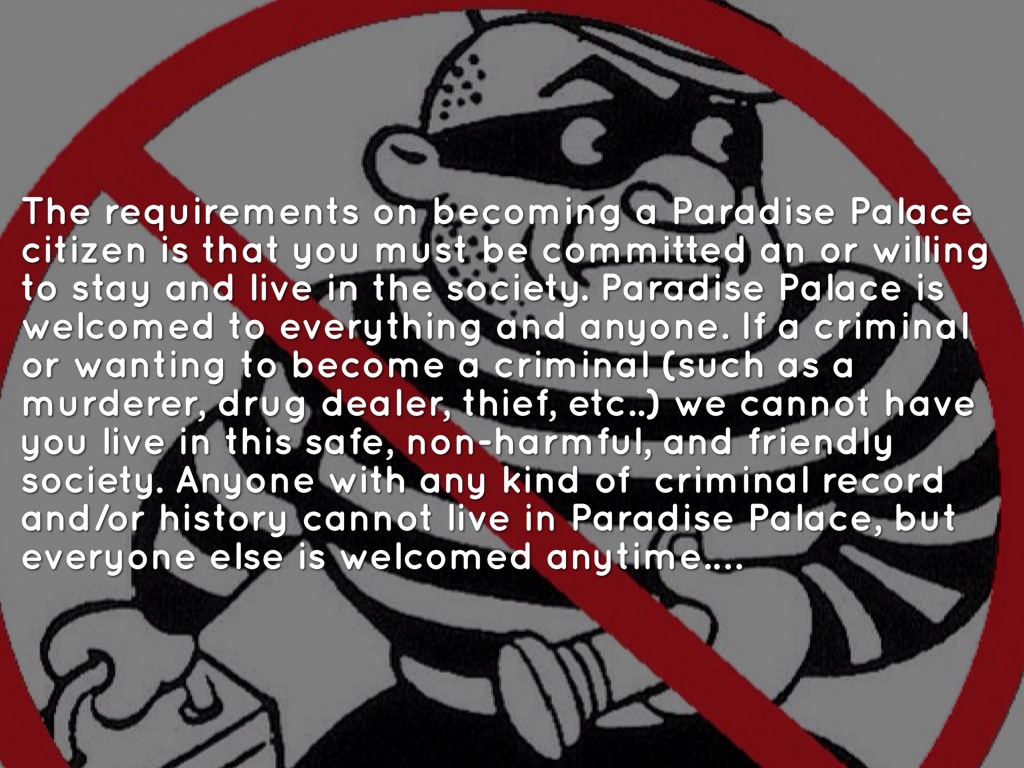 The requirements on becoming a Paradise Palace citizen is that you must be committed an or willing to stay and live in the society. Paradise Palace is welcomed to everything and anyone. If a criminal or wanting to become a criminal (such as a murderer, drug dealer, thief, etc..) we cannot have you live in this safe, non-harmful, and friendly society. Anyone with any kind of criminal record and/or history cannot live in Paradise Palace, but everyone else is welcomed anytime.
