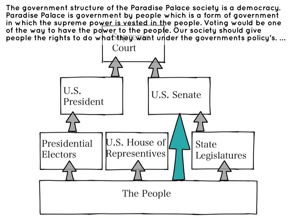 The government structure of the Paradise Palace society is a democracy. Paradise Palace is government by people which is a form of government in which the supreme power is vested in the people. Voting would be one of the way to have the power to the people. Our society should give people the rights to do what they want under the governments policy's.