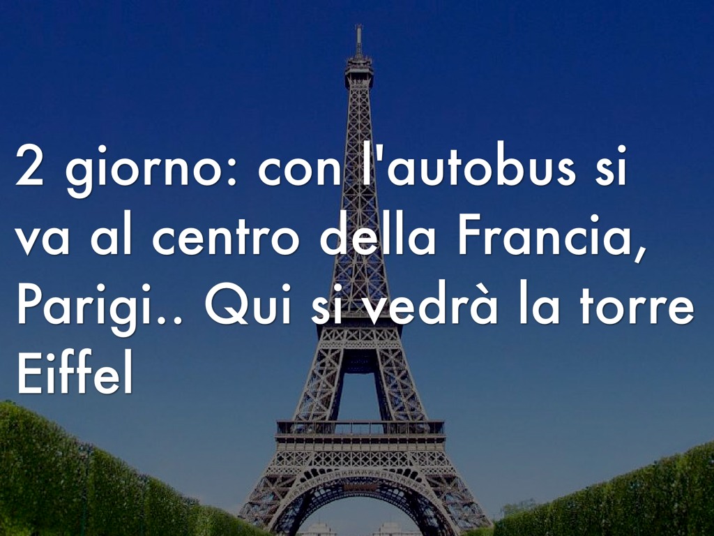 2 giorno: con l'autobus si va al centro della Francia, Parigi.. Qui si vedrà la torre Eiffel