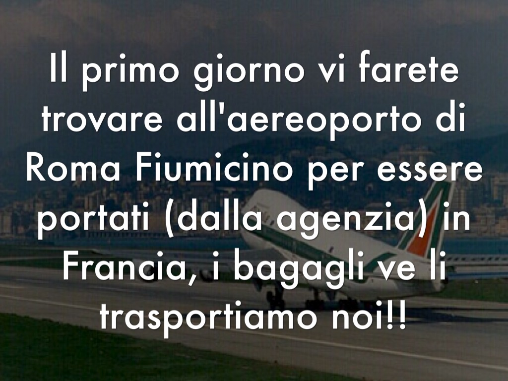 Il primo giorno vi farete trovare all'aereoporto di Roma Fiumicino per essere portati (dalla agenzia) in Francia, i bagagli ve li trasportiamo noi!!