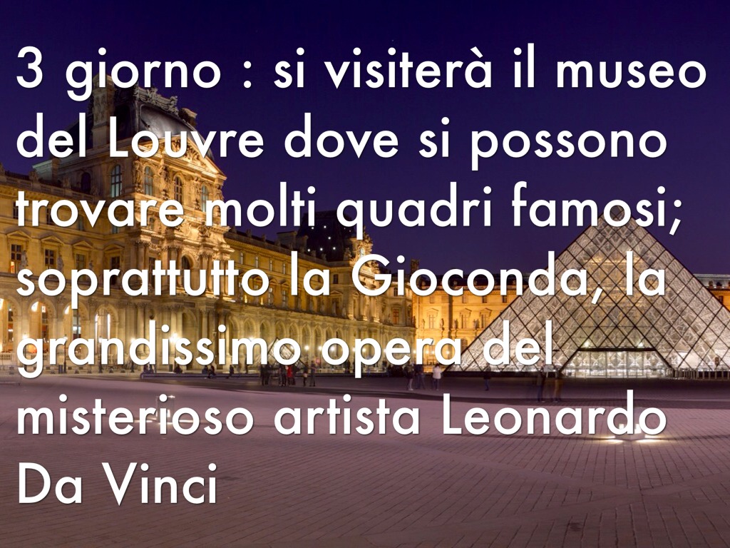 3 giorno : si visiterà il museo del Louvre dove si possono trovare molti quadri famosi; soprattutto la Gioconda, la grandissimo opera del misterioso artista Leonardo Da Vinci