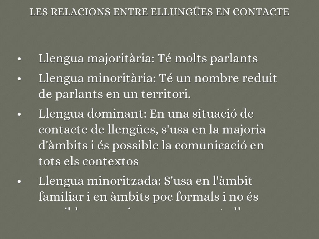 Llengua dominant: En una situació de contacte de llengües, s'usa en la majoria d'àmbits i és possible la comunicació en tots els contextos